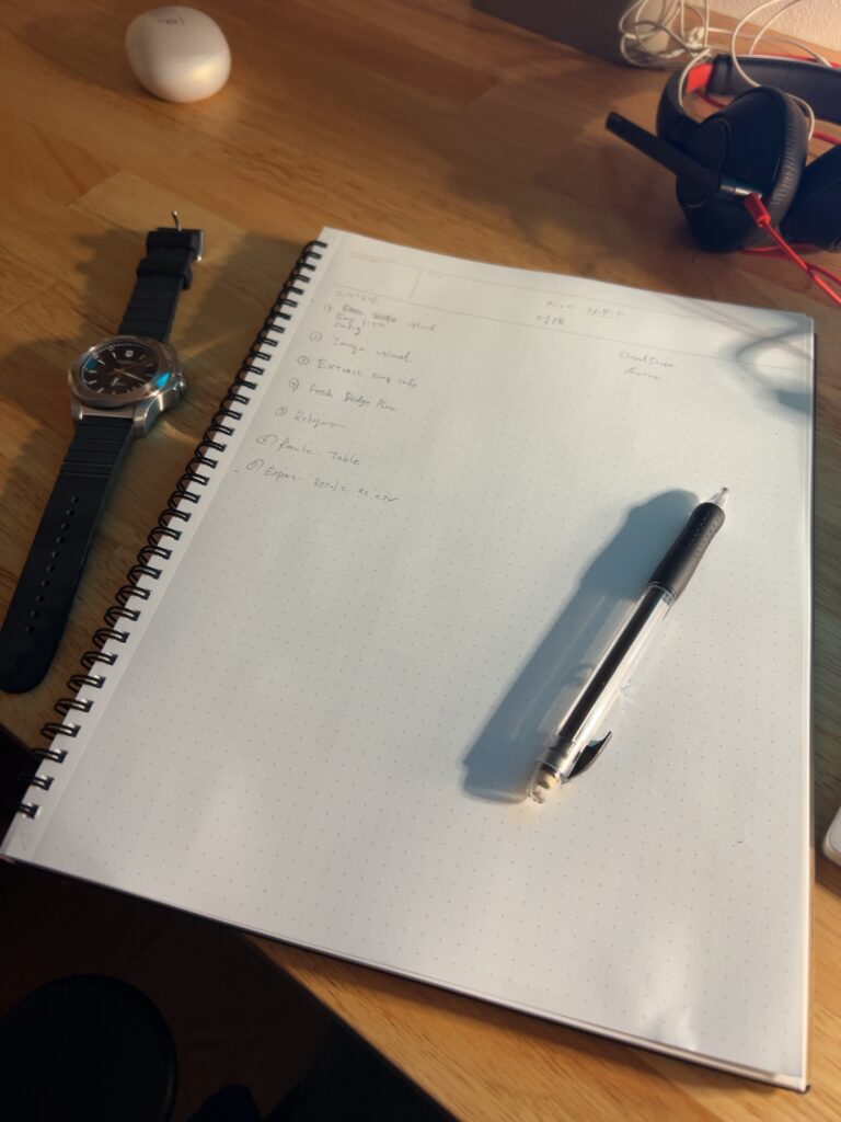 ここ一年くらいで紙媒体のよさを再認識している。ノートはデジタルとアナログが半々くらいのイメージ。細かいルールは設けずにその時のバイブスでどこに何を記録するかは変わってくる。ぼくは仕事の9割を英語でこなすのだけど、大事な思考は日本語のほうがだんぜんに捗るから、ノートには案外日本語の方が多く書いてある。特に生成AIや大規模言語モデル(LLM: Large Language Model)が日常業務においても存在感と重要度を増してきた直近3〜4四半期で感じる仕事の在りかたの変化として、壁打ちの相手としての彼ら(それら)に対し、「どんな問いをあたえるのか」という点がこれからの人間(Human)としての役割になっていくのだろうという実感だ。それはAIが人間の仕事を奪うだの、ホワイトカラーのブルシット・ジョブがどんどん明るみにでるだの、Twitter(つまりX)が8割をレイオフしても成り立っているだの、そういう個別の小さな事例をだけにフォーカスするとなんだか後ろ向きな印象しか与えないものの、すでにいろいろな場所で議論されているとおり、どうやって役割分業し、共存の道を探っていくのか、そのほうがよっぽど建設的な議論であろう。ソースがどこだったか忘れたけれど、GenAIとLLMの広がりを形容するパンチラインとして記憶に残っているのはこれだ。
